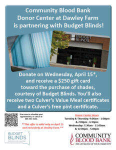 Schedule a donation date / time that works for you by selecting the link below. Wednesday, April 22 from 8am to 11am and 12:30pm to 3:30pm. Click HERE to schedule